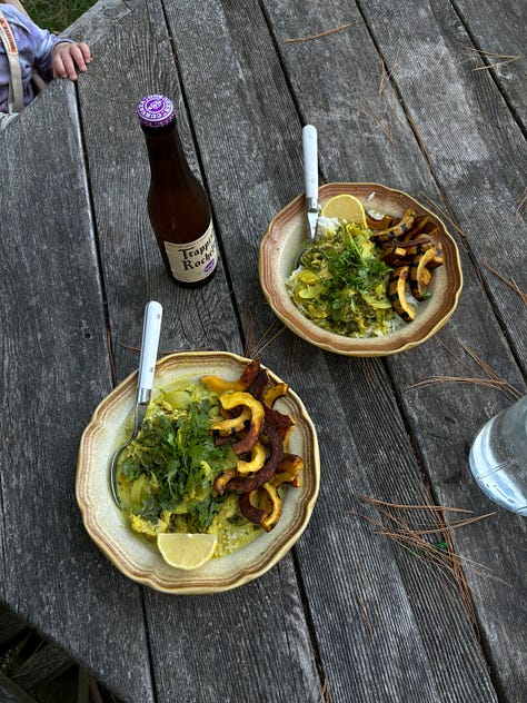 Seasonal eating reaches peak creativity & possibility in September. Tomato harvests overlap with storage sweeties…. the ripened honeynut squash, the long awaited leek, big winter beets, fall brassicas. After a walk through the field there is seemingly no salad that cannot be summoned up in the kitchen. Yesterday, lunch was a warming, herby golden chicken curry & dinner was a tomato & pear bruschetta. I LOVE this fleeting moment in time every year.