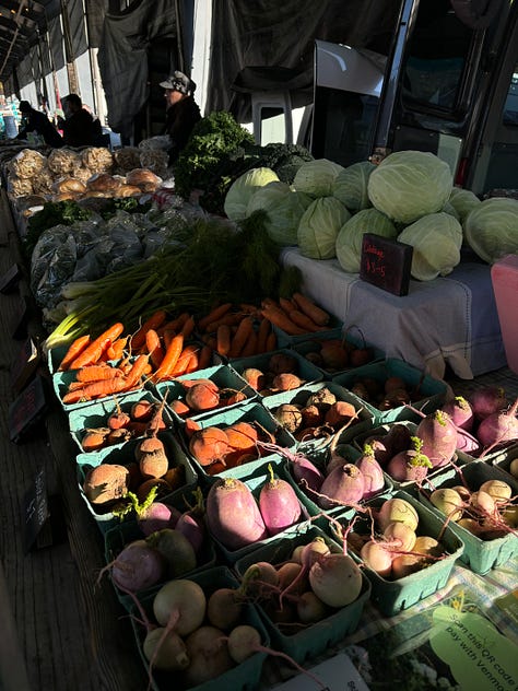 Last week we sat around the table for Kade & Michelle’s last field day of the season. We ate grits, pork chops, bacon, roasted butternut squash, and brothy herby kale. We were also supposed to have beans & honey roasted walnuts but my mind is not as sharp these days, so they both got nice n burnt! Nonetheless, the meal came together. In 2024, we spent every lunch together, enjoying something freshly made from the field’s bounty. A routine that I really cherished. This season, I did not have the capacity to cook us all lunch, but I look forward to picking the habit back up.
